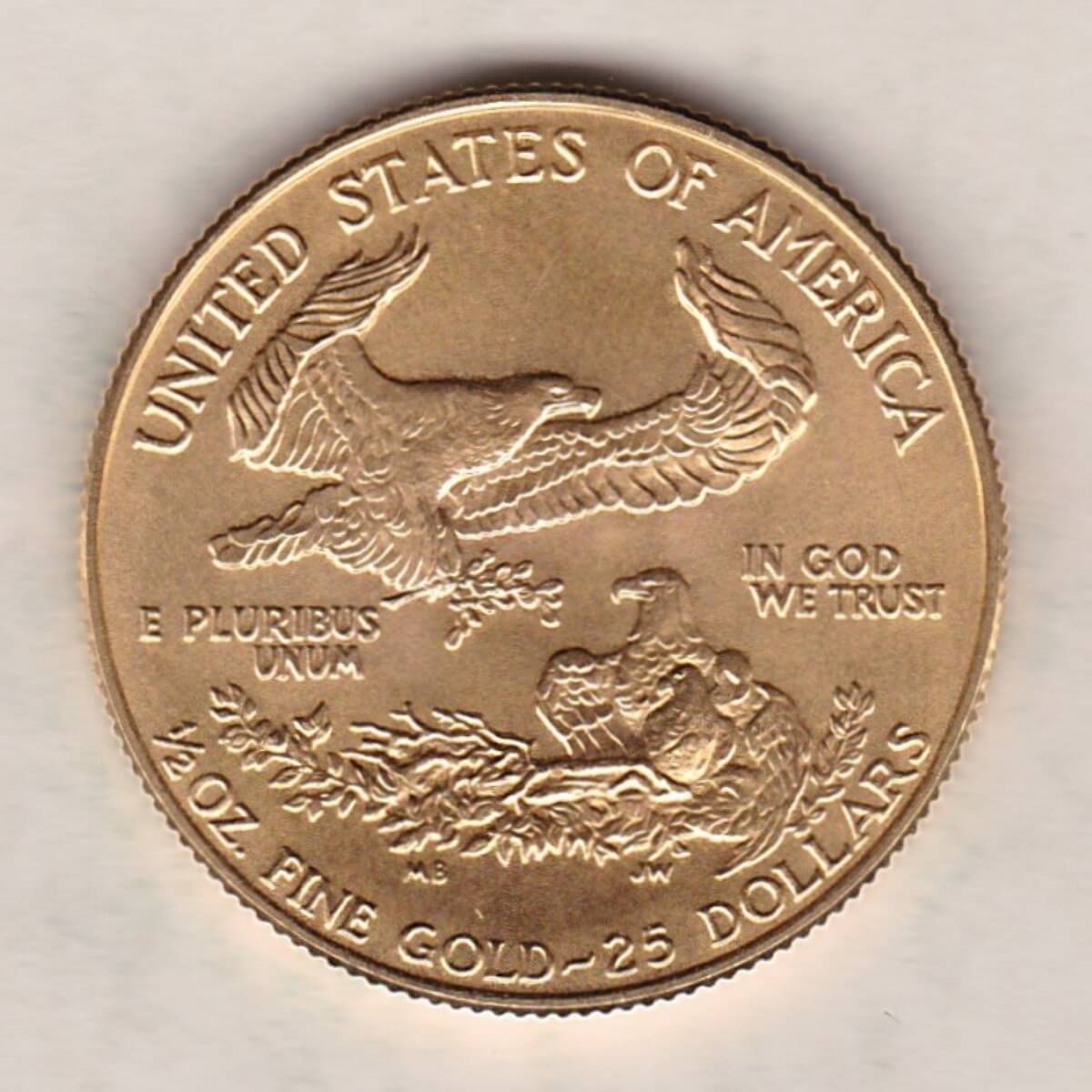The half ounce US gold eagle has an intrinsic value of twenty five US Dollars.