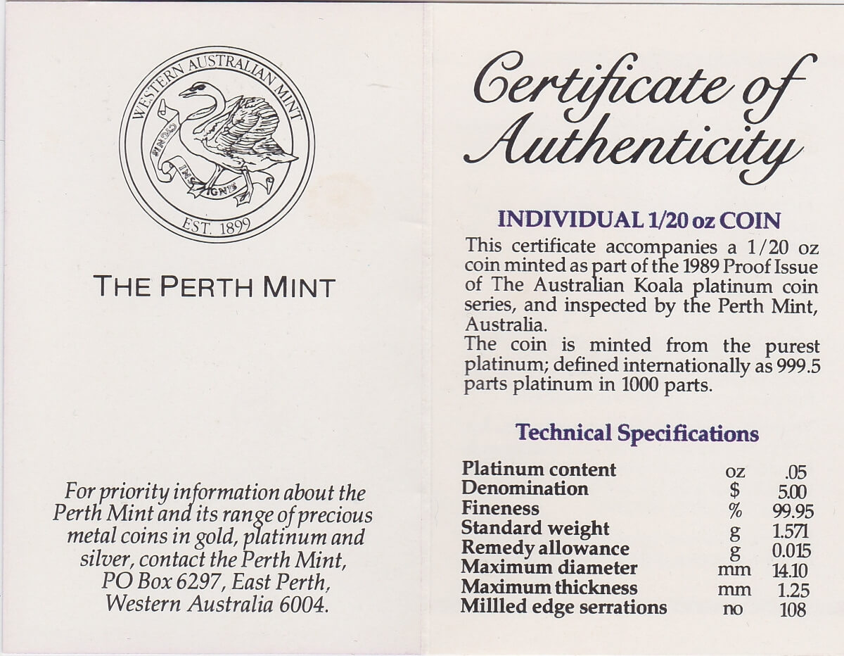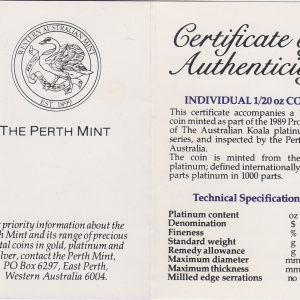 1989 Australia Platinum Proof Twentieth Ounce Coin In Mint Condition.