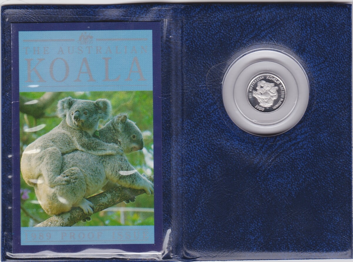 This coin was issued in platinum by the Perth mint in Australia. The obverse features the third portrait of Queen Elizabeth II facing right wearing the King George IV State Diadem. The reverse features a koala with baby Koala on its back clutching a limb of a gum tree.