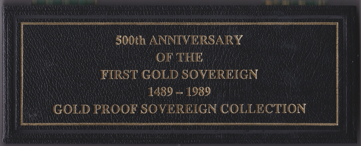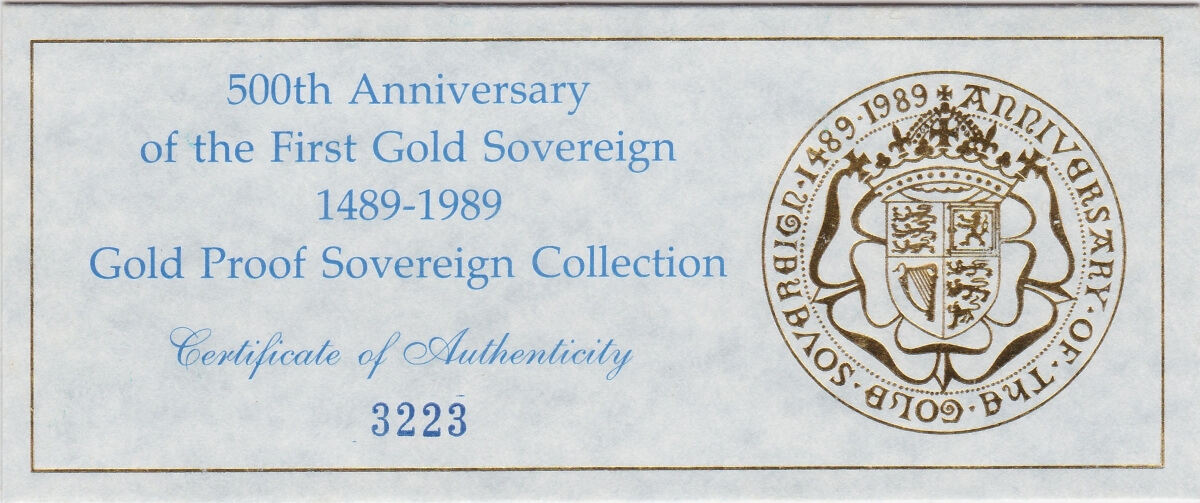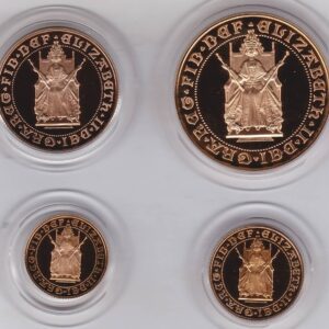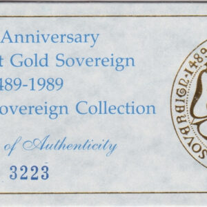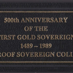 Each coin in this 1989 Gold Proof Four Coin Set was struck to commemorate the 500th anniversary of the first hammered gold Sovereign in 1489. It was a one-year issue and is considered a sought-after celebratory edition. The coin features Queen Elizabeth II seated on King Edward’s Coronation throne on the obverse, and a double Tudor Rose with the Royal Arms shield and an open King’s Crown on the reverse. The reverse also includes the legend “ANNIVERSARY OF THE GOLD SOVEREIGN 1489 1989”.