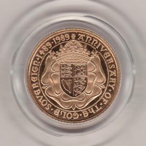 The 1989 proof half sovereign is a coin struck in 22 carat gold by the Royal Mint to commemorate the 500th anniversary of the first hammered gold Sovereign in 1489. It was a one-year issue and is considered a sought-after celebratory edition. The coin features Queen Elizabeth II seated on King Edward’s Coronation throne on the obverse, and a double Tudor Rose with the Royal Arms shield and an open King’s Crown on the reverse. The reverse also includes the legend “ANNIVERSARY OF THE GOLD SOVEREIGN 1489 1989”.