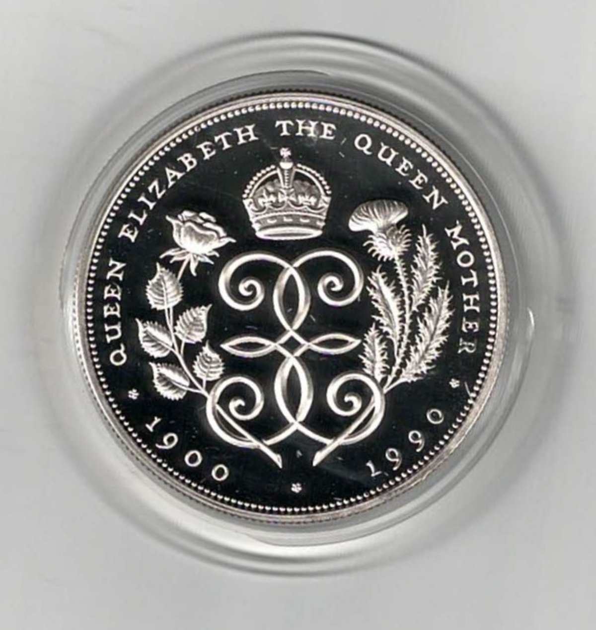 This is a commemorative coin marking 90th anniversary of the birth of the Queen Mother.