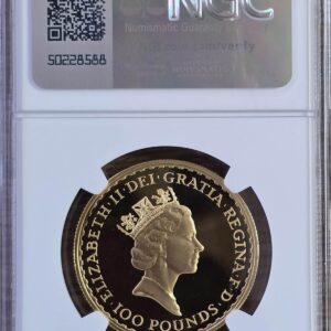 1990 Gold Proof One Ounce Britannia coin. Queen Elizabeth II obverse. The standing Britannia design on the reverse. One ounce coin.1990 Gold Proof One Ounce Britannia – PF70 Ultra Cameo