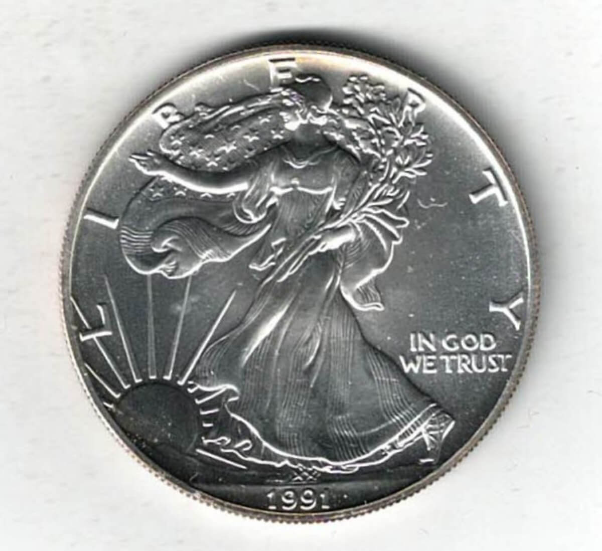 The 1991 Eagle is a coin struck in fine silver by the US Mint . The obverse features Walking Liberty . The reverse features the Heraldic eagle with shield.