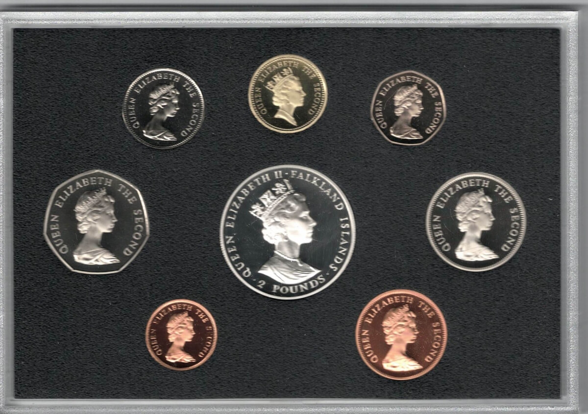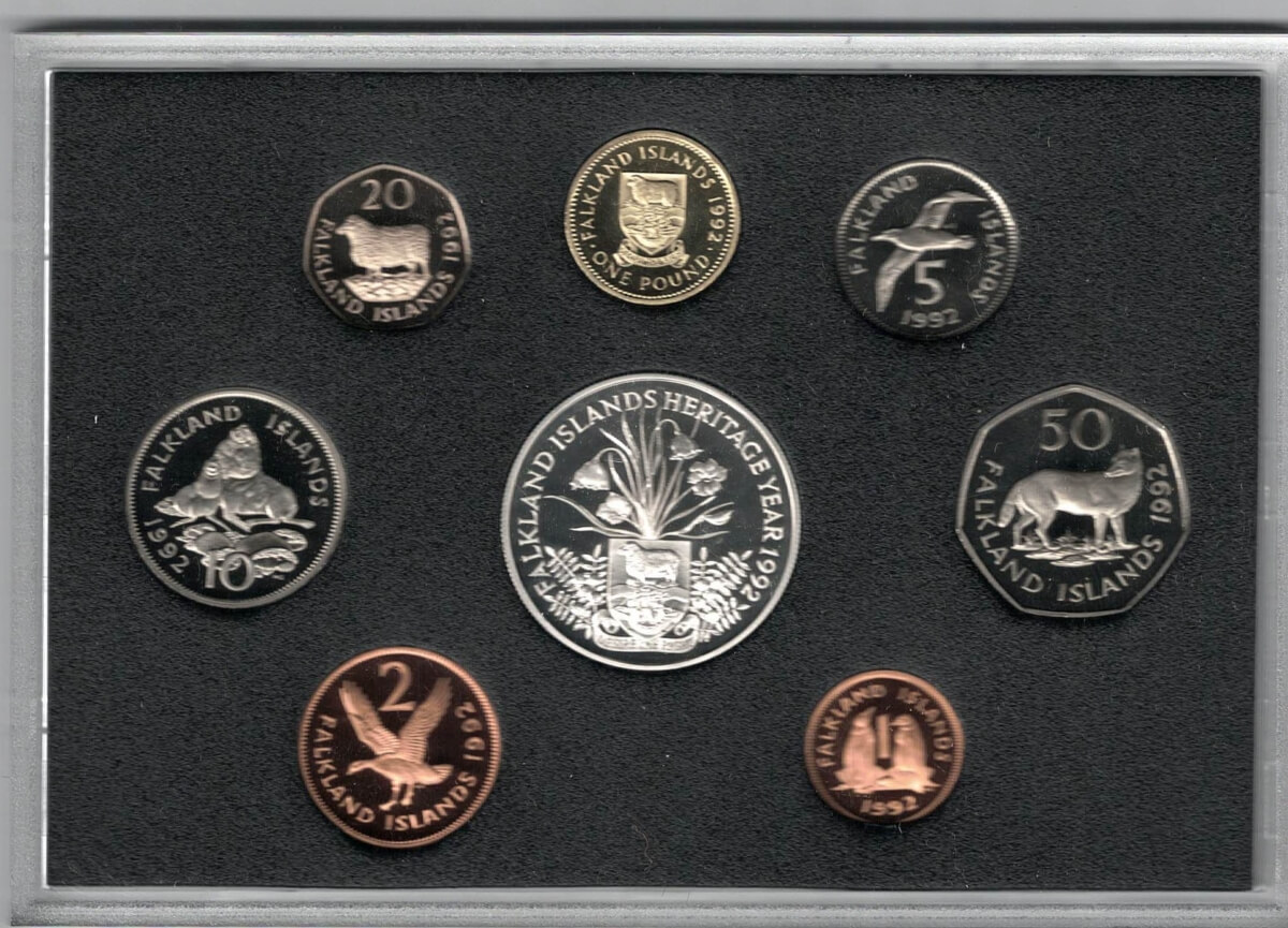 1992 Falkland Islands Heritage Year Eight Coin Proof Set. The obverse features the portrait of Queen Elizabeth II facing right.1992 Falkland Islands Heritage Year Eight Coin Proof Set