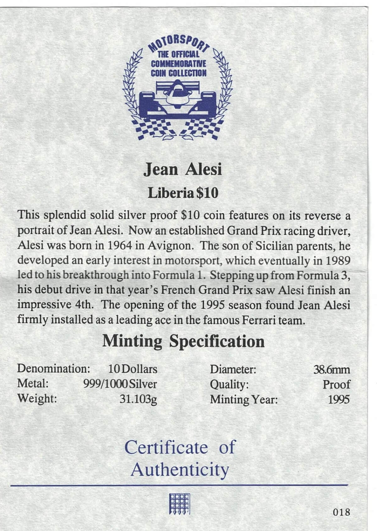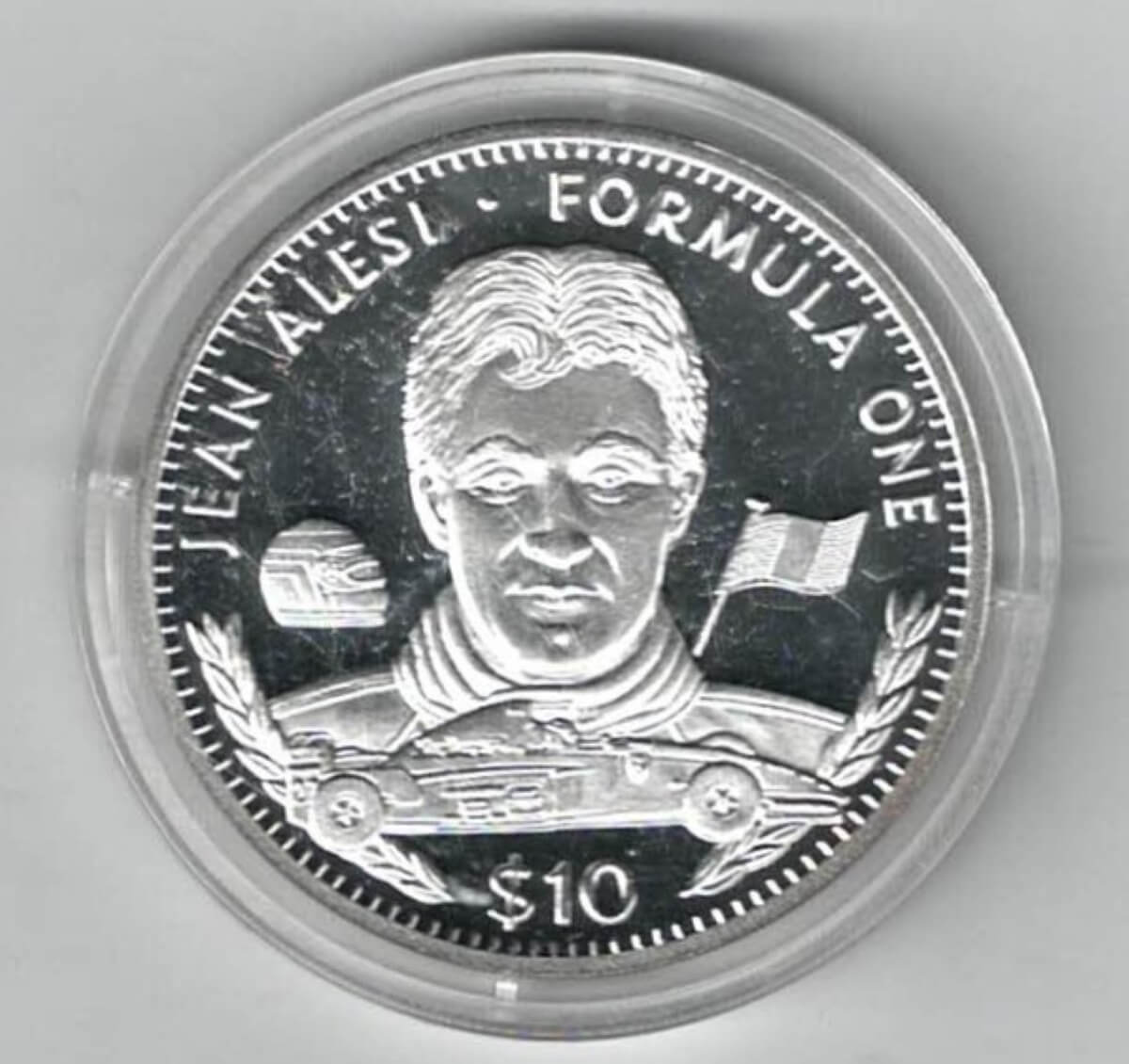 The Obverse side of the coin features the coat of arms of Liberia. The reverse features Jean Alesi, formula 1 car & flag.