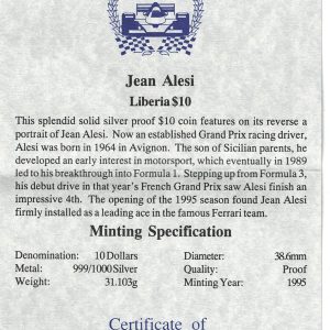 1995 Liberia Silver One Ounce Jean Alesi