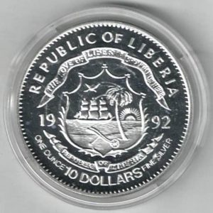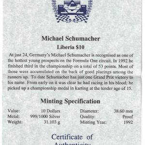 1992 Liberia Silver One Ounce Michael Schumacher $10 Coin in Near Mint Condition.