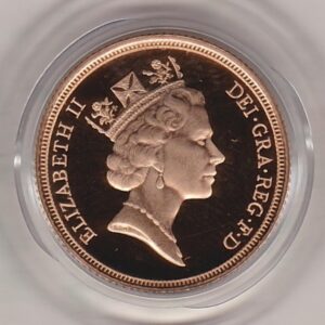 The 1993 proof sovereign is a coin struck in 22 carat gold by the Royal Mint. The obverse features the portrait of Queen Elizabeth II facing right. On the reverse side of this coin you can see Benedetto Pistrucci’s depiction of Saint George slaying a dragon. The coin’s date is also inscribed at the bottom of the reverse.