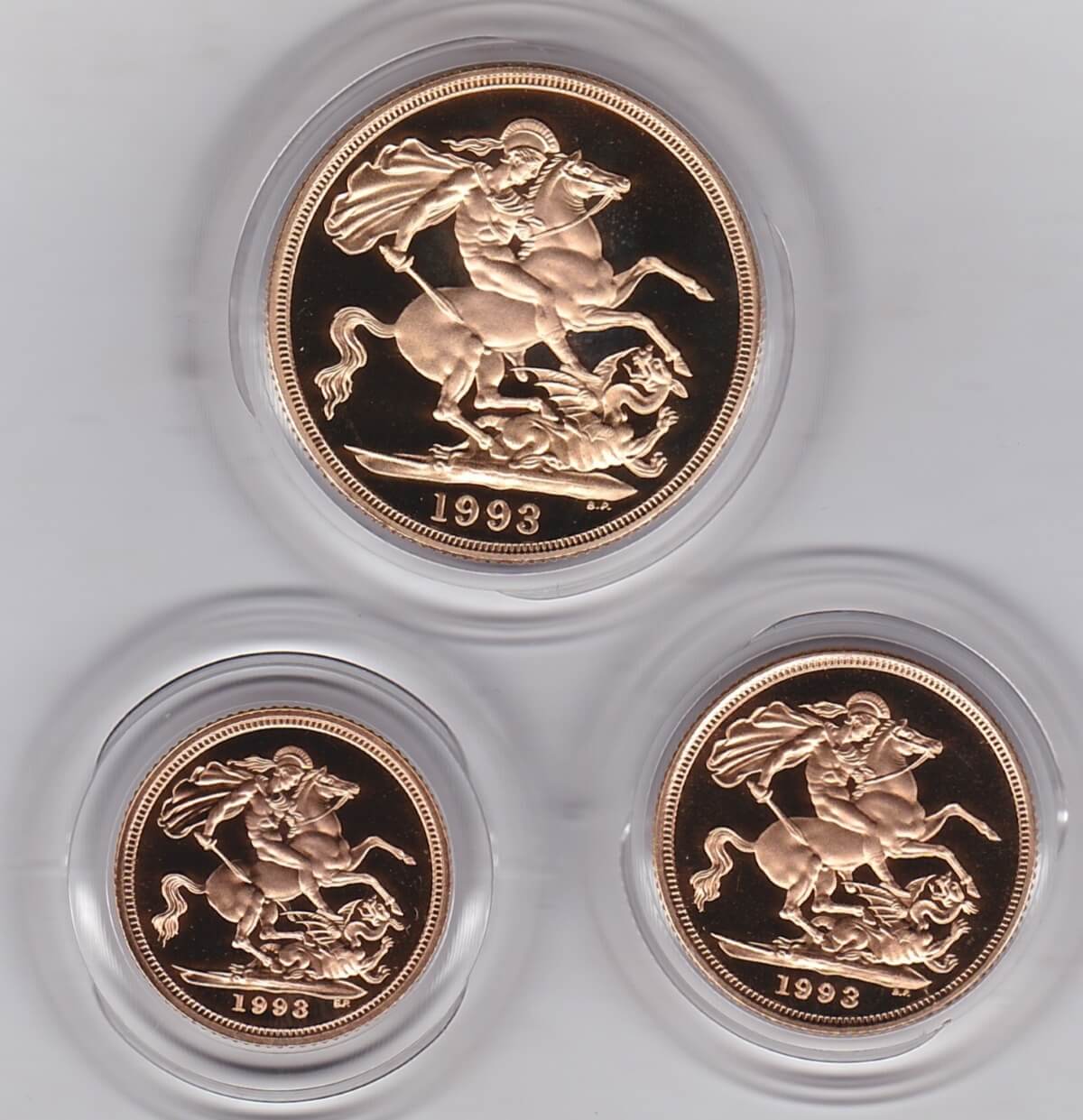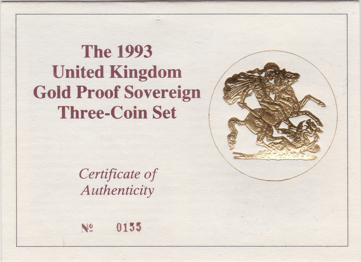 1993 Gold Proof Three Coin Set. This three coin gold sovereign set comes boxed with certificate as issued by the Royal Mint.1993 Gold Proof Three Coin Sovereign Set