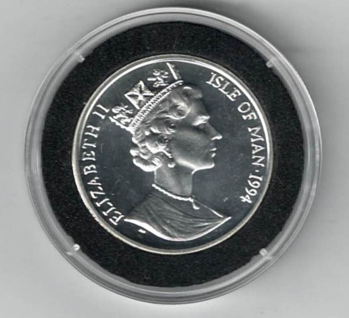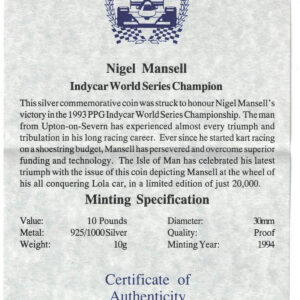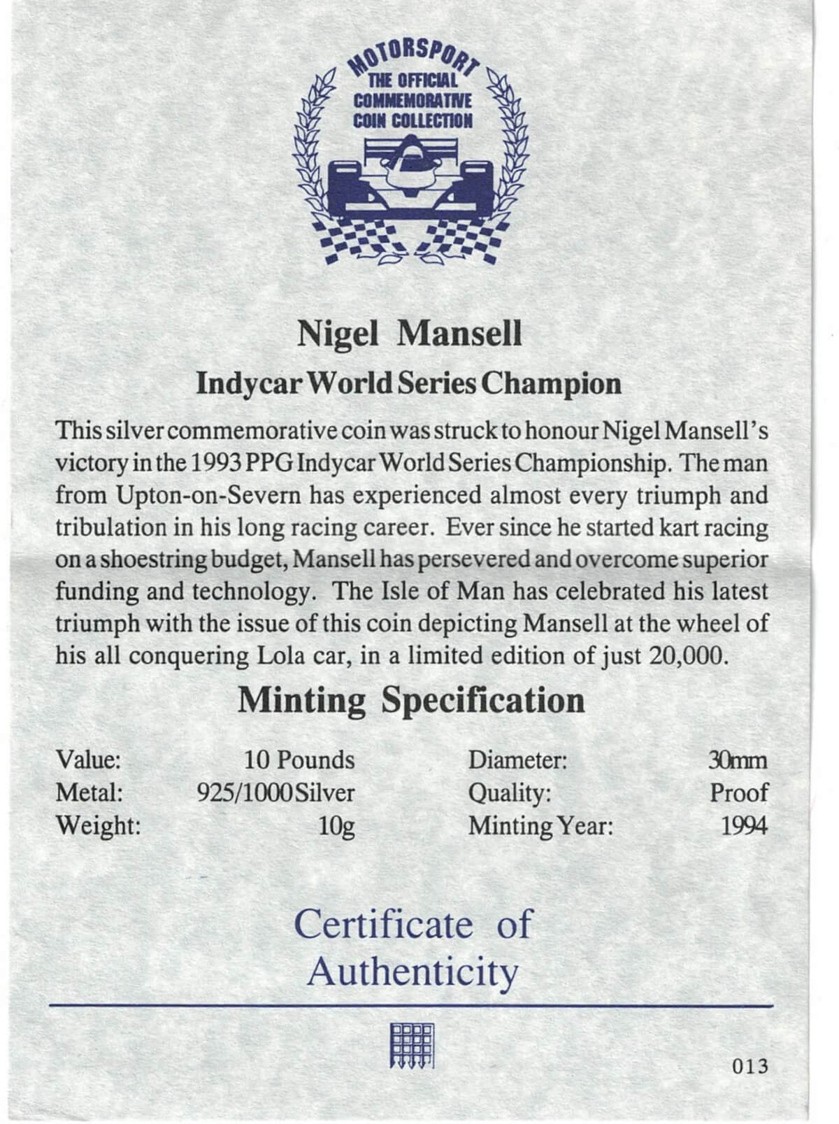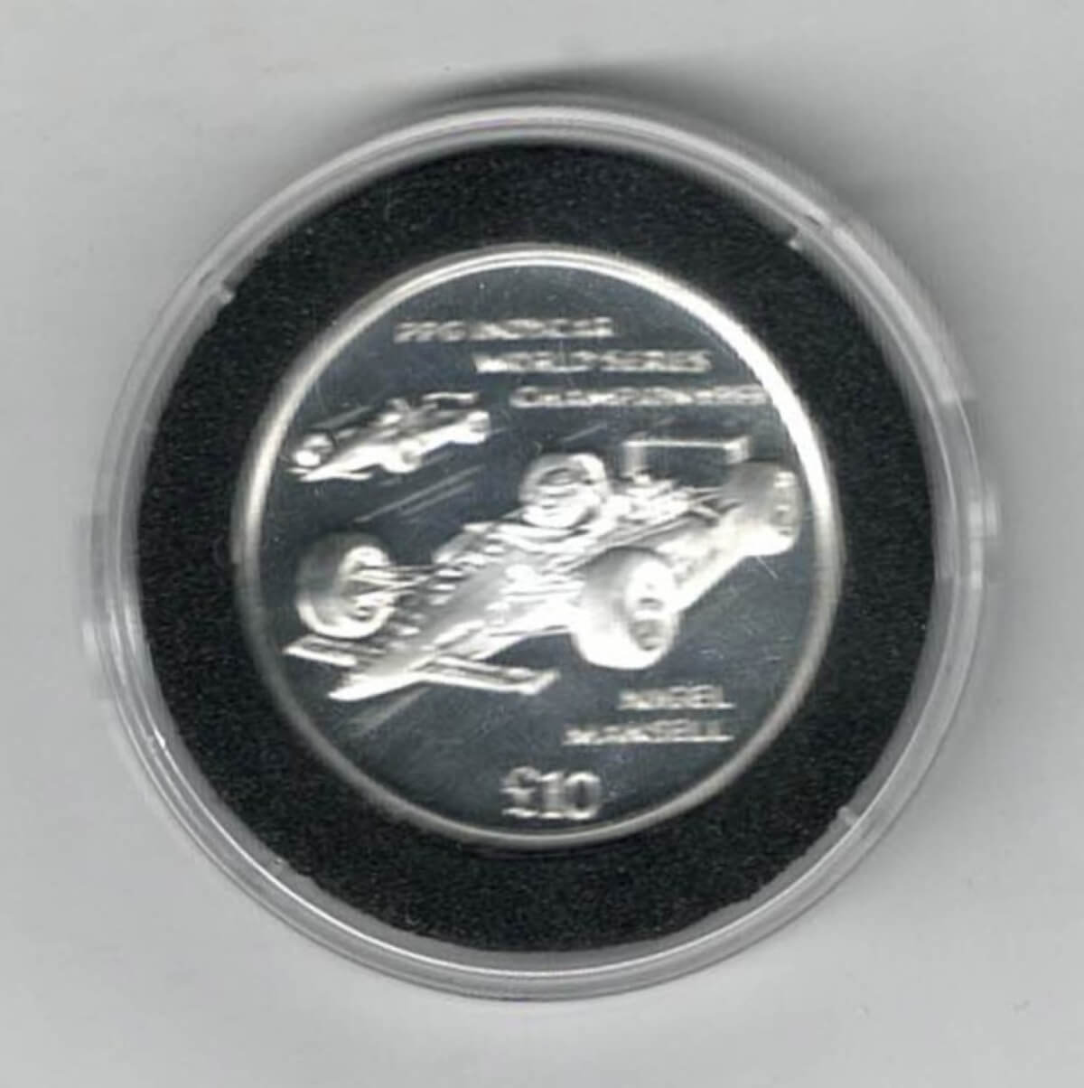 1994 Isle Of Man Nigel Mansell Silver Proof Ten Pound Coin In Near Mint Condition.