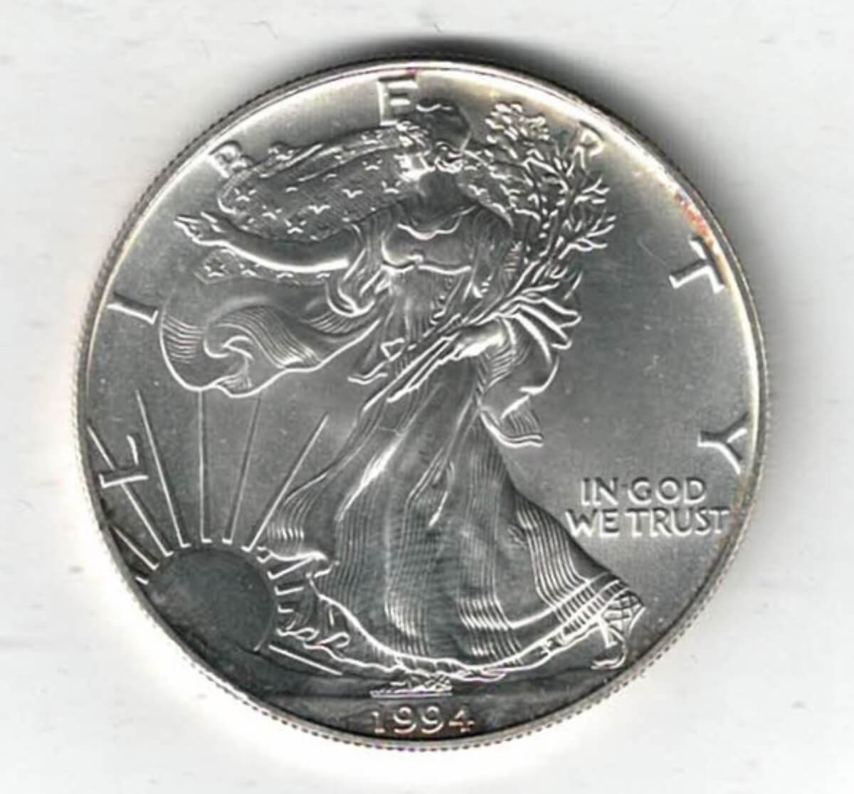 The 1994 Eagle is a coin struck in fine silver by the US Mint . The obverse features Walking Liberty . The reverse features the Heraldic eagle with shield.