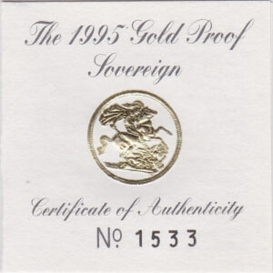 1995 gold proof sovereign coin featuring queen Elizabeth II on the Obverse & St George and the Dragon Reverse. This coin comes as issued by the royal mint.1995 Gold Proof Sovereign Coin