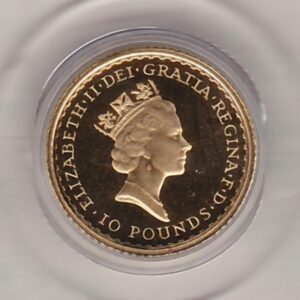 The 1995 gold tenth ounce Britannia was minted by the Royal Mint. The coin depicts a portrait of Queen Elizabeth II on the Obverse. The reverse features the design by Philip Nathan, this classic standing Britannia image of Britannia, a female personification of Britain.