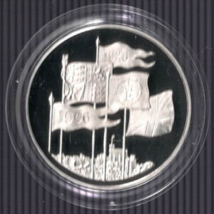 This coin has an intrinsic value of £5. This proof coin was struck in 0.925 silver and weighs approx. 28.28 grams.The Obverse features the crowned portrait of Queen Elizabeth II facing right. The reverse features Windsor Castle with Royal Standard, the Union Flag, and the Queen’s personal flag. Two accompanying pennants bear the anniversary dates.