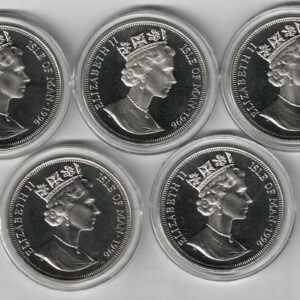 1996 Isle Of Man Legend Of King Arthur Five Crown Coin Set. The obverse of each coin features the portrait of Queen Elizabeth II.1996 Isle Of Man Legend Of King Arthur Five Crown Coin Set