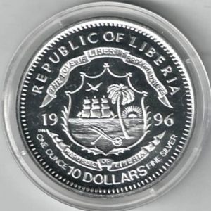 1996 Liberia Silver One Ounce Johnny Herbert $10 Coin in Near Mint Condition.