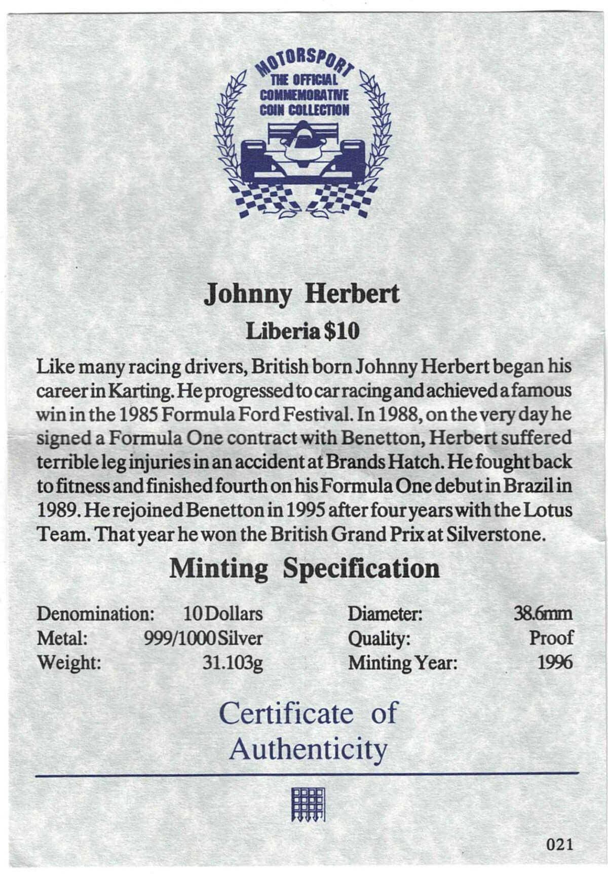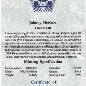 The Obverse side of the coin features the coat of arms of Liberia. The reverse features Johnny Herbert, formula 1 car, helmet & flag.