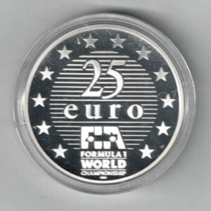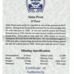 1997 Alain Prost Silver Proof Twenty Five Euro Coin In Near Mint Condition.