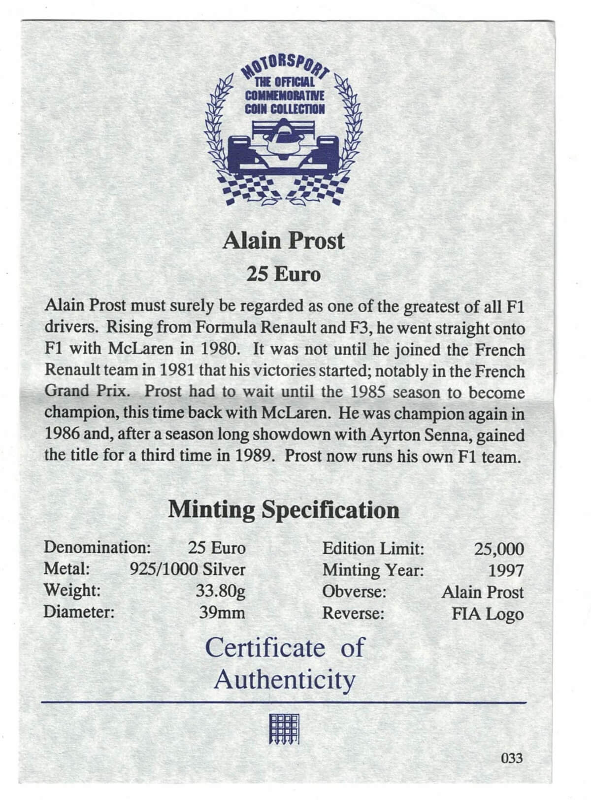 This coin features Alain Prost with the world champion winning dates.