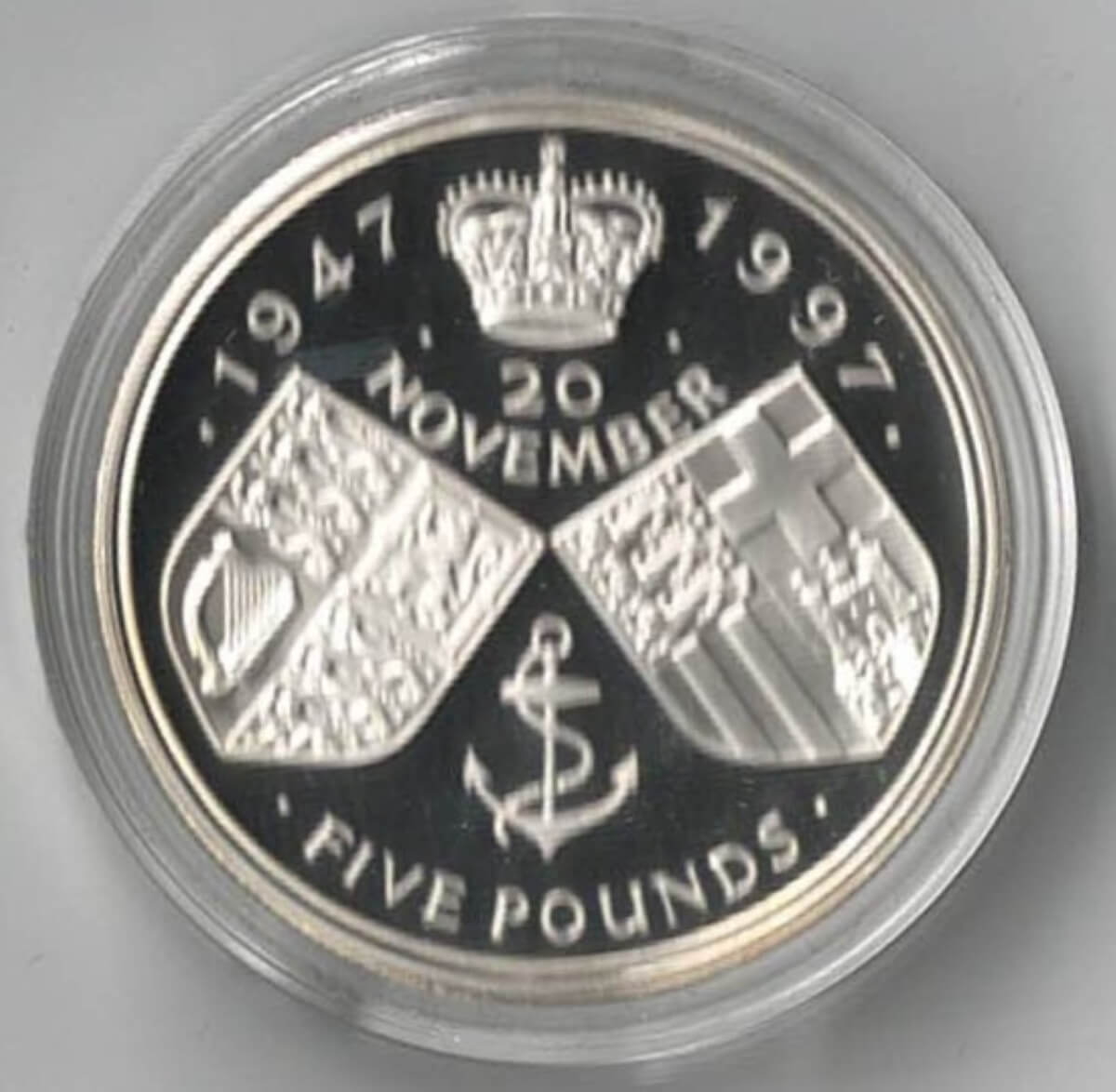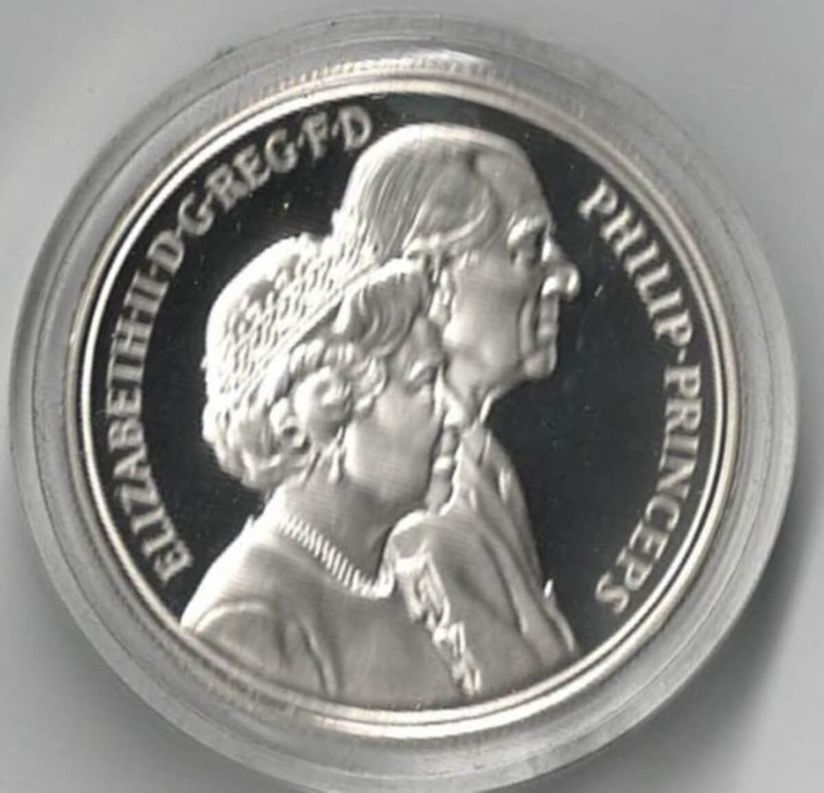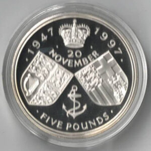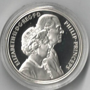 The set contains a commemorative Silver Proof coin. This coin has an intrinsic value of £5. This proof coin was struck in 0.925 silver and weighs approx. 28.28 grams. The reverse is designed by Leslie Durbin and combines the Royal Arms and the Arms of Prince Philip. Above the Arms is a Royal Crown beneath them is an anchor representing the Prince’s naval career. The obverse features the crowned portrait of Queen Elizabeth II and Prince Philip, facing right.
