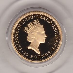 The 1997 gold tenth ounce Britannia was minted by the Royal Mint. The coin depicts a portrait of Queen Elizabeth II on the Obverse. The reverse features the design by Philip Nathan, this classic standing Britannia image of Britannia, a female personification of Britain.