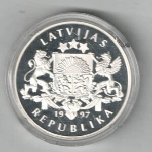 1997 Latvia Silver Proof Riga Ship Ten Latu Coin. The obverse side of this coin features the coat of arms of Latvia. All coins are in stock.1997 Latvia Silver Proof Riga Ship Ten Latu Coin