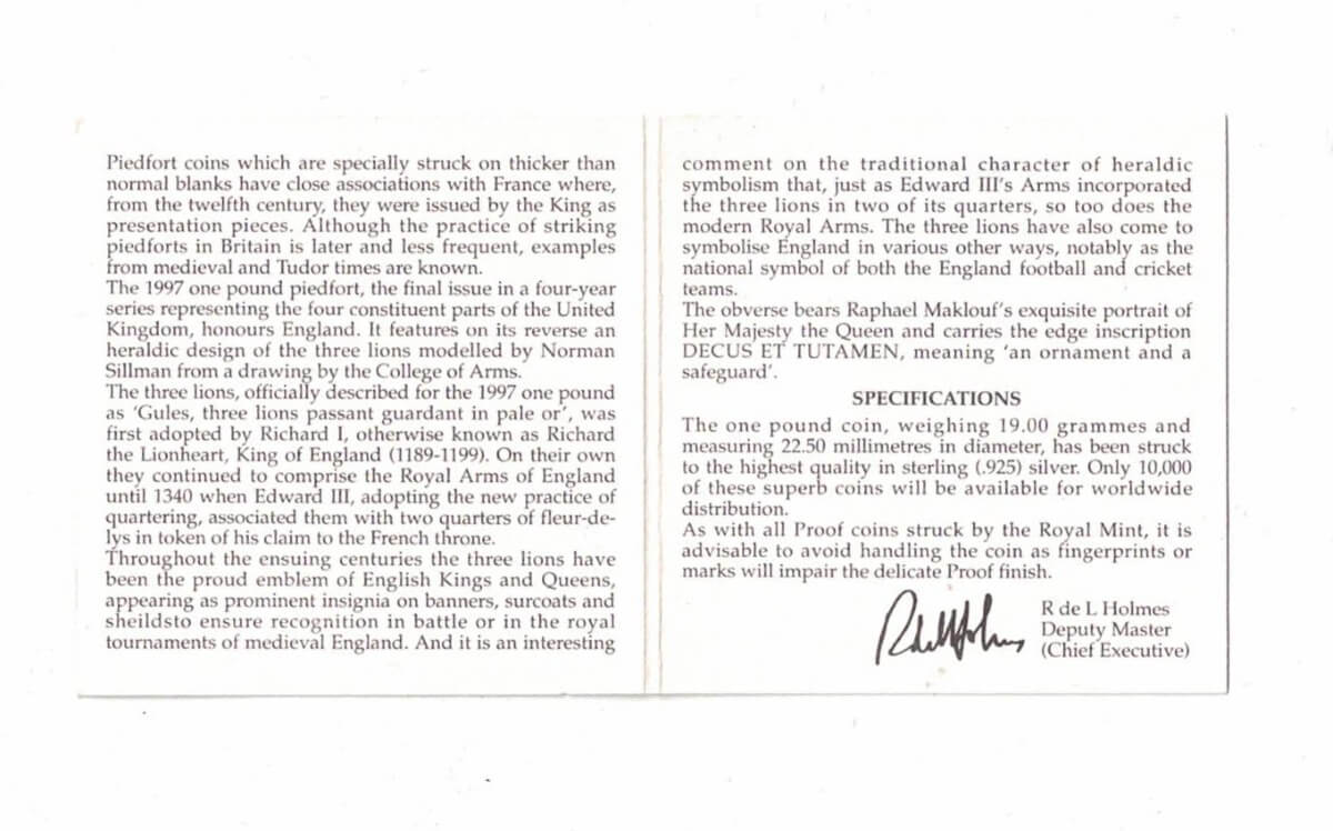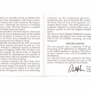 1997 One Pound Piedfort Silver Proof ‘Three Lions’ Coin In Near Mint Condition.