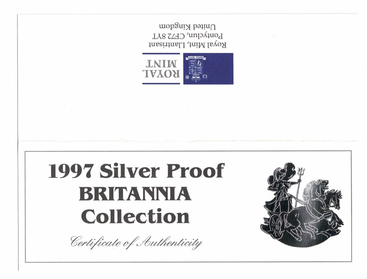 The 1997 Britannia proof set was struck in 0.958 silver by the Royal Mint. The obverse on each coin features the portrait of Queen Elizabeth II facing right. The reverse features Britannia with a trident and shield.