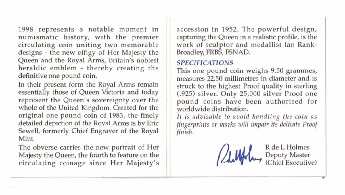 1998 One Pound Silver Proof Royal Arms