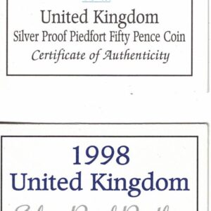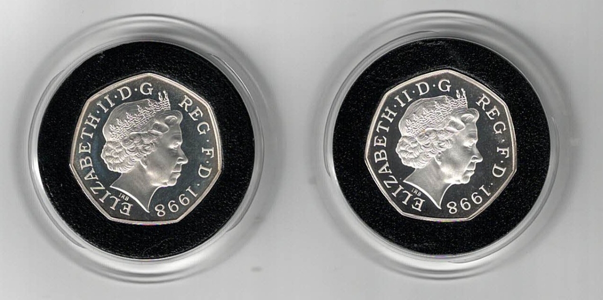 These 1998 coins are struck in .925 silver with a proof finish by the Royal Mint. Proof coins are hand-finished to create a flawless effect, and are often struck multiple times with specially prepared dies to achieve a mirrored finish and clarity of detail.