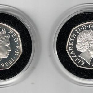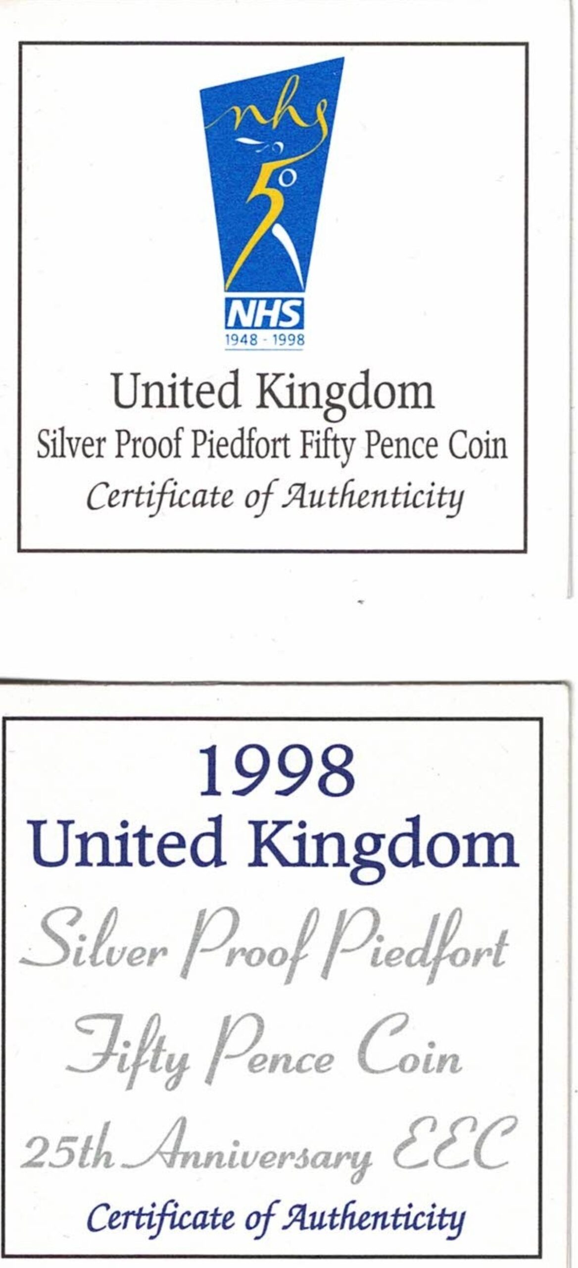 1998 Piedfort Silver Proof Fifty Pence Two Coin Set ‘European Union and NHS’ in Near Mint Condition.