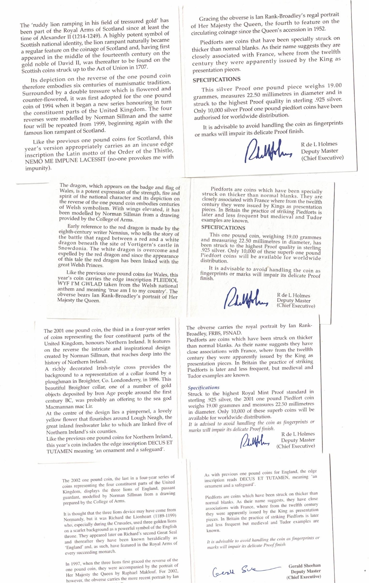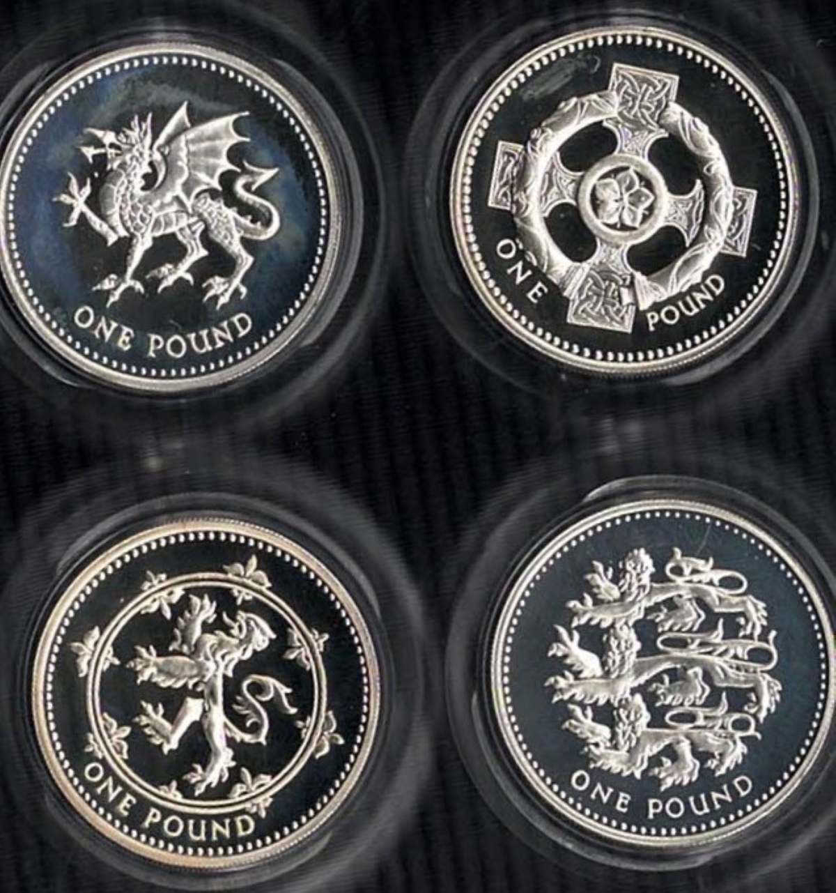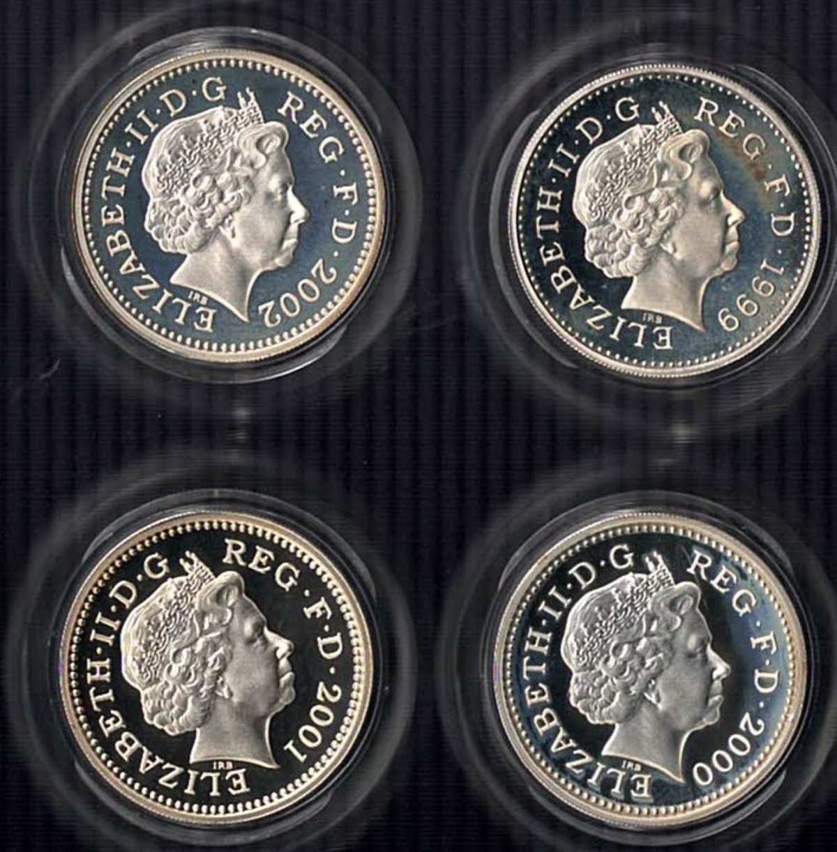 The Obverse side of these coins features the Queen Elizabeth II. The reverse images ae different, 1999 features the Royal Arms of Scotland, 2000 features the Welsh Dragon, 2001 features the Celtic Cross and 2002 features the English Lions.