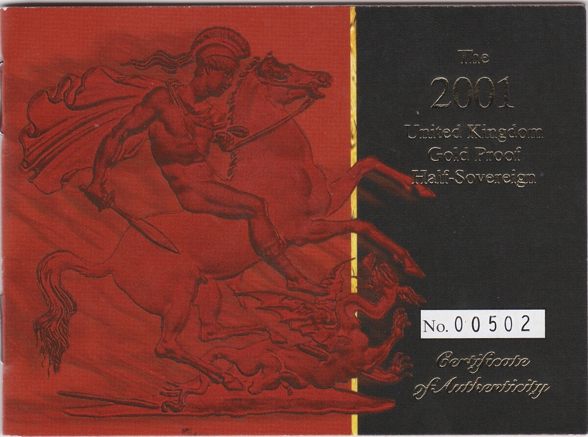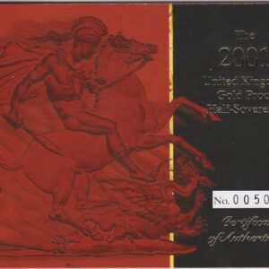 The 2001 half sovereign is a coin struck in 22 carat gold as a proof by the Royal Mint. The Obverse features the fourth crowned portrait of Queen Elizabeth II facing right, wearing the Girls of Great Britain and Ireland tiara, with legend around. The Reverse features St. George slaying the dragon right, with date and designer’s initials in exergue.