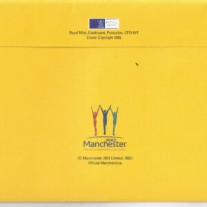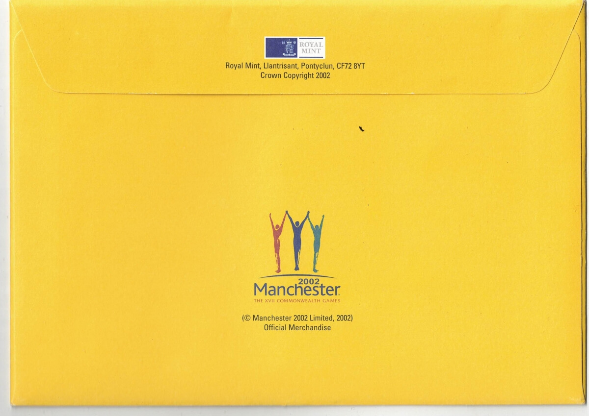 These 2002 coins have the fourth portrait of Queen Elizabeth II on the obverse facing right. The reverse features a moving figure holding a banner, divided into lines to symbolise a running track with lanes and flags.