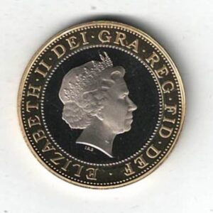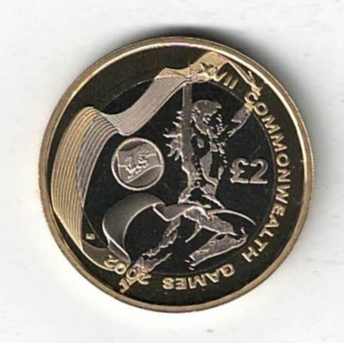 This 2002 coin has the fourth portrait of Queen Elizabeth II on the obverse facing right. The reverse features a moving figure holding a banner, divided into lines to symbolise a running track with lanes with the Wales flag.