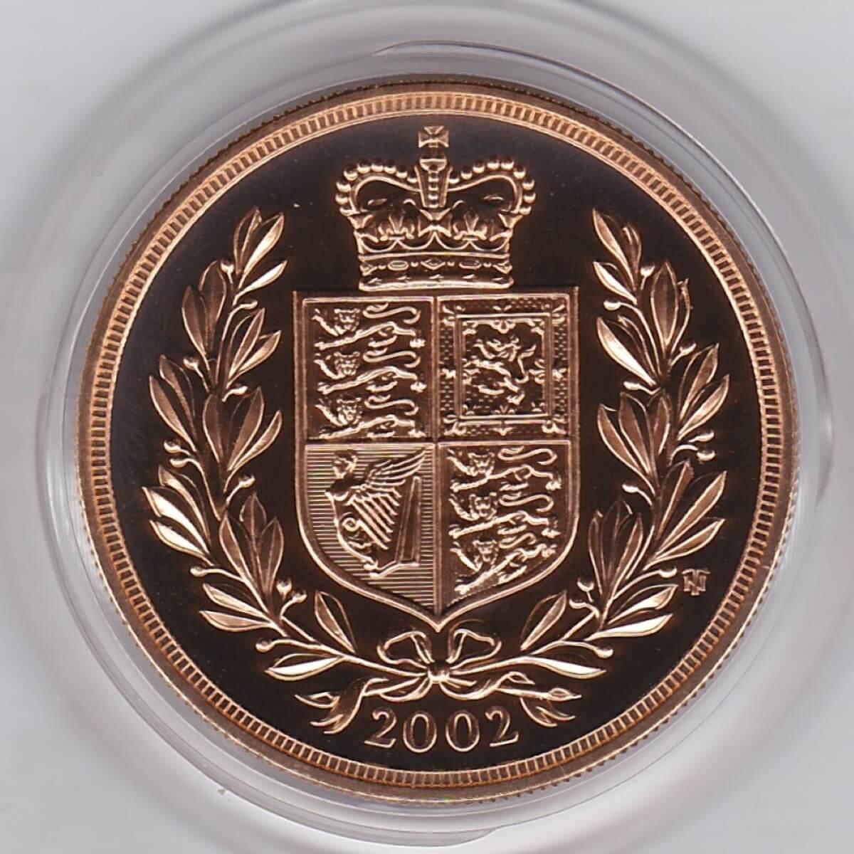 This 2002 five pounds, five sovereigns or quintuple sovereign is a coin struck in 22 carat gold by the Royal Mint. The Obverse features the portrait of HM Queen Elizabeth II facing right. The reverse of this unique coin features a shield of royal arms inside an open laurel wreath, with a crown above the shield, with the date at the bottom. The design was created by heraldic artist Timothy Noad to celebrate the Queen’s Golden Jubilee.