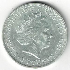 The 2003 Britannia is a coin struck in .958.4 silver by the Royal Mint. The obverse features the fourth portrait of Queen Elizabeth II facing right. The reverse features a helmeted head head of Britannia facing left.