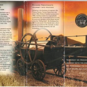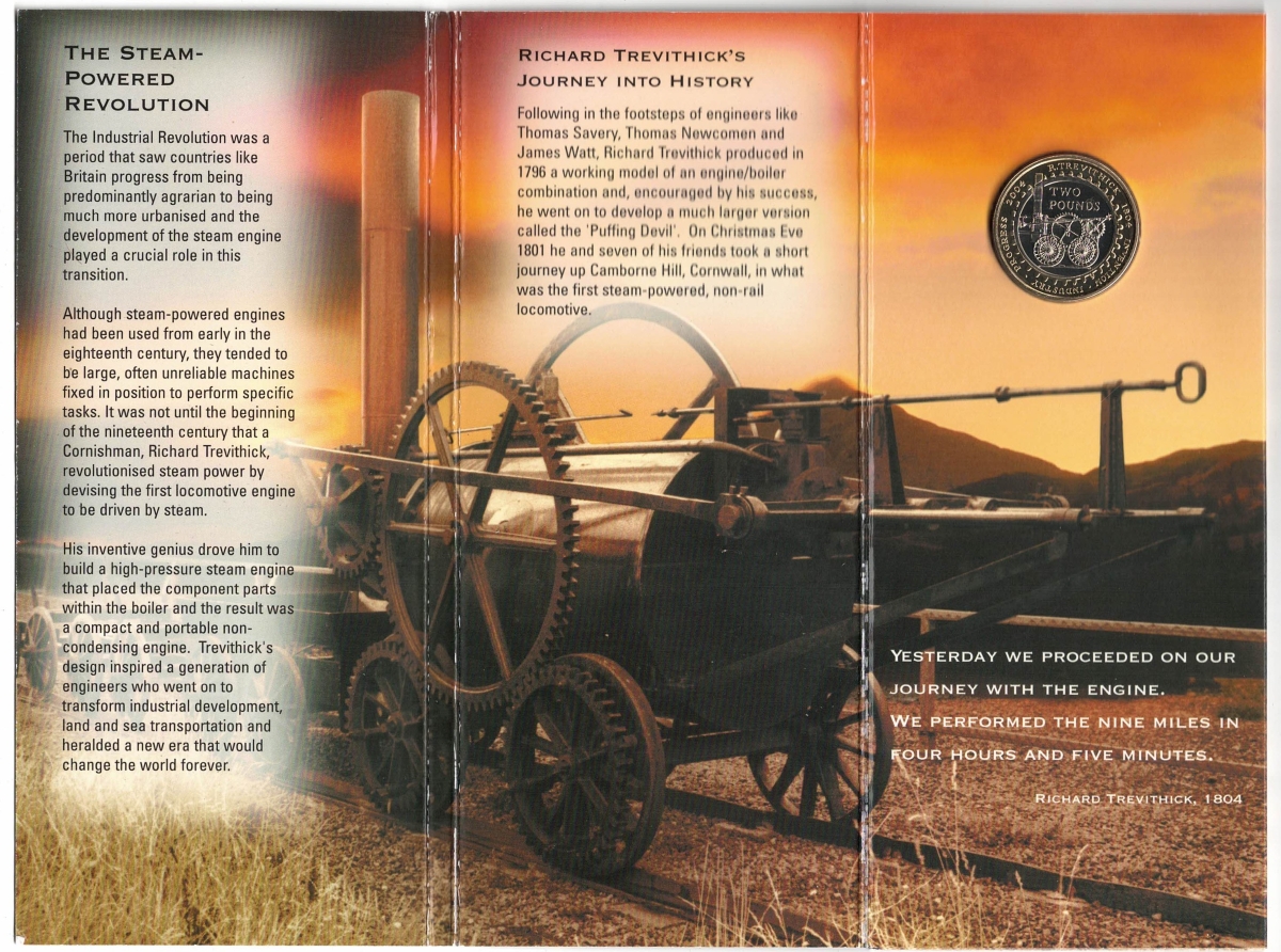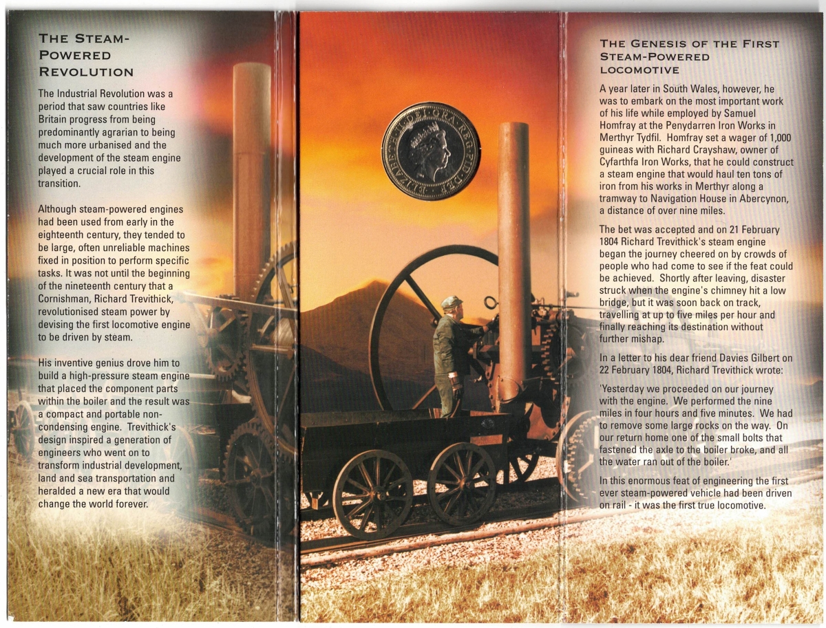 The Obverse side of this coin features the forth crowned portrait of HM Queen Elizabeth II. The reverse features an image of Trevithick’s locomotive Penydarren surrounded by a cog representing the industrial revolution.