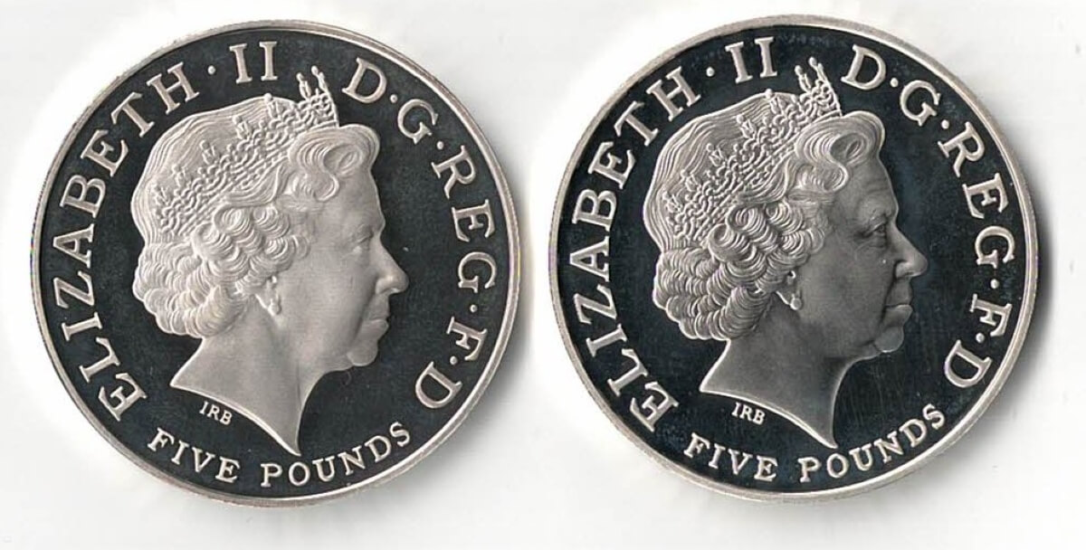 These coins feature the portrait of Elizabeth II facing right on the Obverse. The reverse images are different, one features Royal Navy ships Victory and Temeraire in the midst of battle. The other features a uniformed portrait of Admiral Lord Nelson.