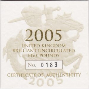 This 2005 five pounds, five sovereigns or quintuple sovereign is a coin struck in 22 carat gold by the Royal Mint. The Obverse features the portrait of HM Queen Elizabeth II facing right. The reverse features the stylized view of St. George slaying the dragon on horseback.