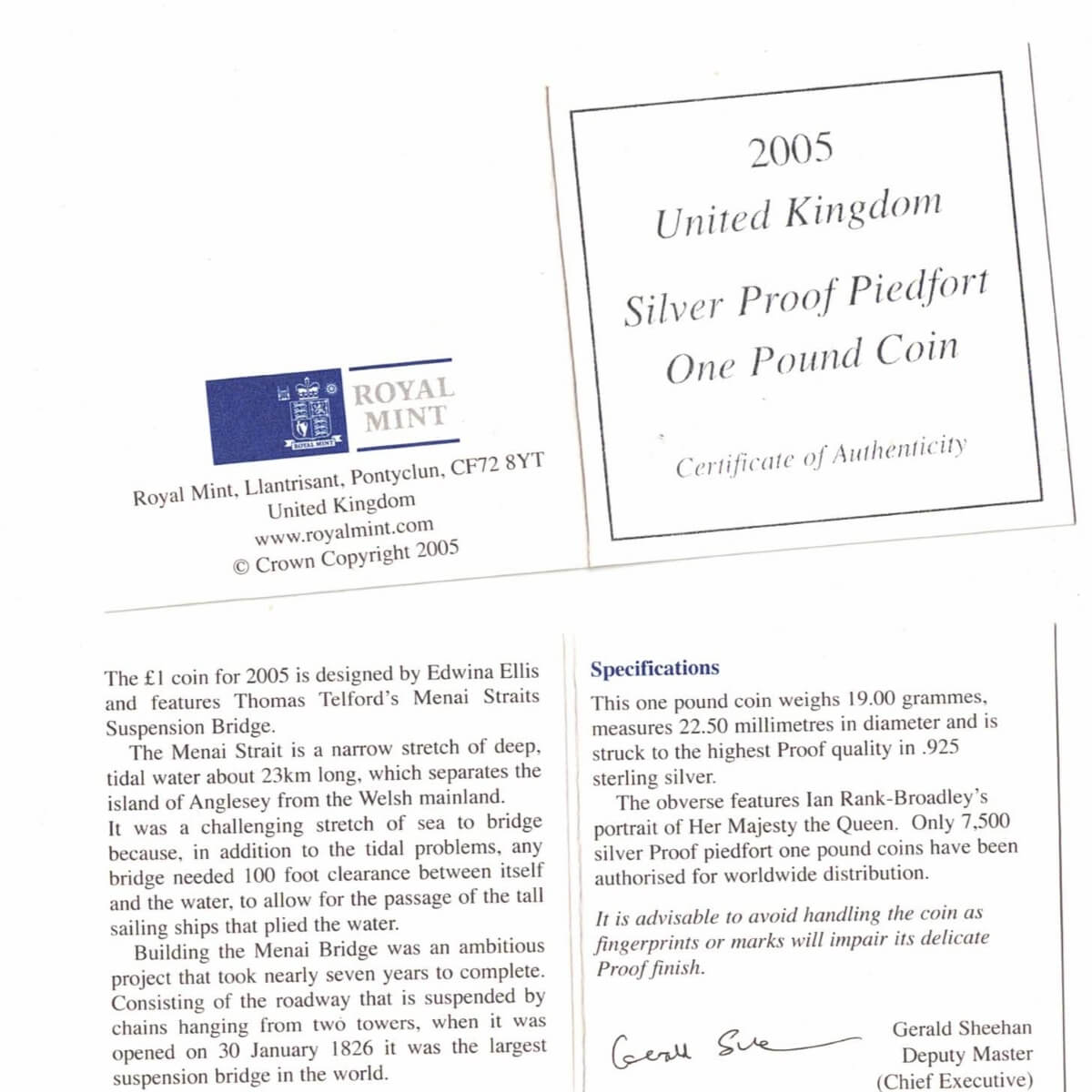 2005 One Pound Piedfort Silver Proof ‘Menai Bridge’ Coin In Near Mint Condition.