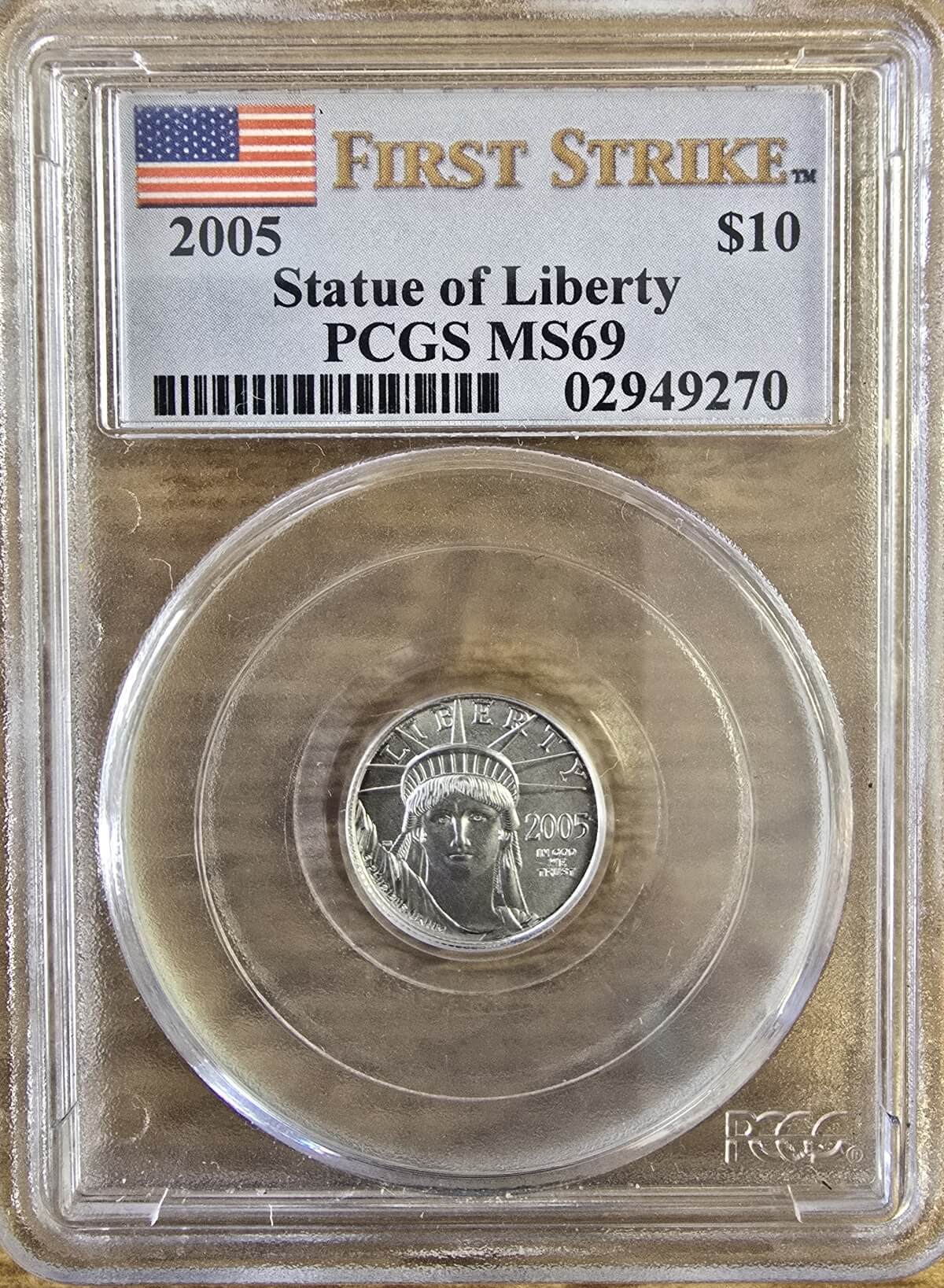 The USA 2005 platinum tenth ounce coin was struck by the United States Mint of Philadelphia. The obverse features the Statue of Liberty with the date to the right. The reverse features a flying eagle with the country name above, the platinum content to the right, and the denomination below.