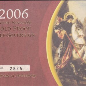 The 2006 half sovereign is a coin struck in 22 carat gold as a proof by the Royal Mint. The Obverse features the fourth crowned portrait of Queen Elizabeth II facing right, wearing the Girls of Great Britain and Ireland tiara, with legend around. The Reverse features St. George slaying the dragon right, with date and designer’s initials in exergue.
