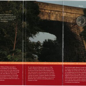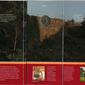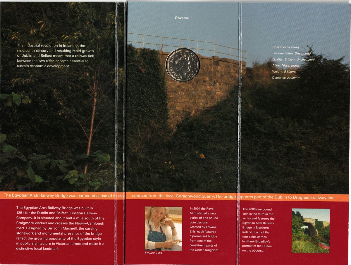 This 2006 coin has the forth portrait of Queen Elizabeth II on the obverse facing right. The reverse features a representation of the Egyptian Arch railway bridge at Newry in Northern Ireland, inside a border of railway station canopy dags.
