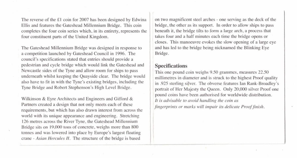 2007 One Pound Silver Proof Gateshead Millennium Bridge Coin in presentation box. All coins in stock and ready to despatch.2007 One Pound Silver Proof Gateshead Millennium Bridge Coin