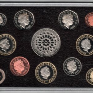 The coins in this set contains the range of UK coins from the 1p to the £5. Each Coin in this collection features the portrait of the Queen Elizabeth II on the obverse , except for the Five Pound Coin which is a commemorative issue marking the 60th wedding anniversary of Queen Elizabeth II and Prince Philip. this coin features conjoined portraits of the Queen and HRH Philip on the Obverse and The Rose window of Westminster Abbey on the reverse.
