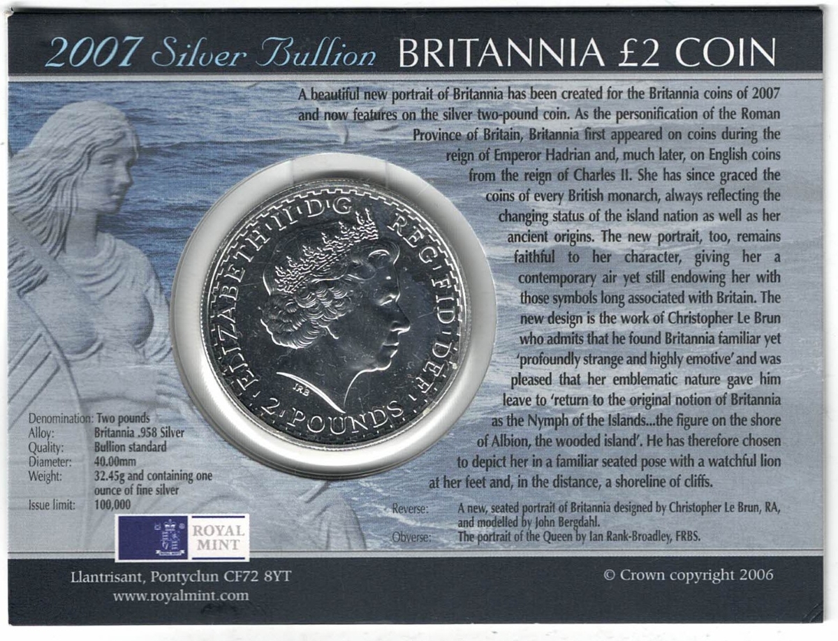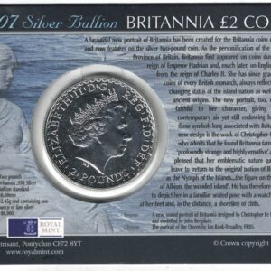 The 2007 Britannia is a coin struck in .958.4 silver by the Royal Mint. The obverse features the fourth portrait of Queen Elizabeth II facing right. The reverse features a seated figure of Britannia.