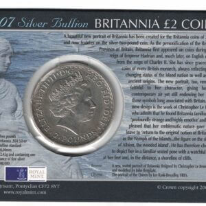 The 2007 Britannia is a coin struck in .958.4 silver by the Royal Mint. The obverse features the fourth portrait of Queen Elizabeth II facing right. The reverse features a seated figure of Britannia.