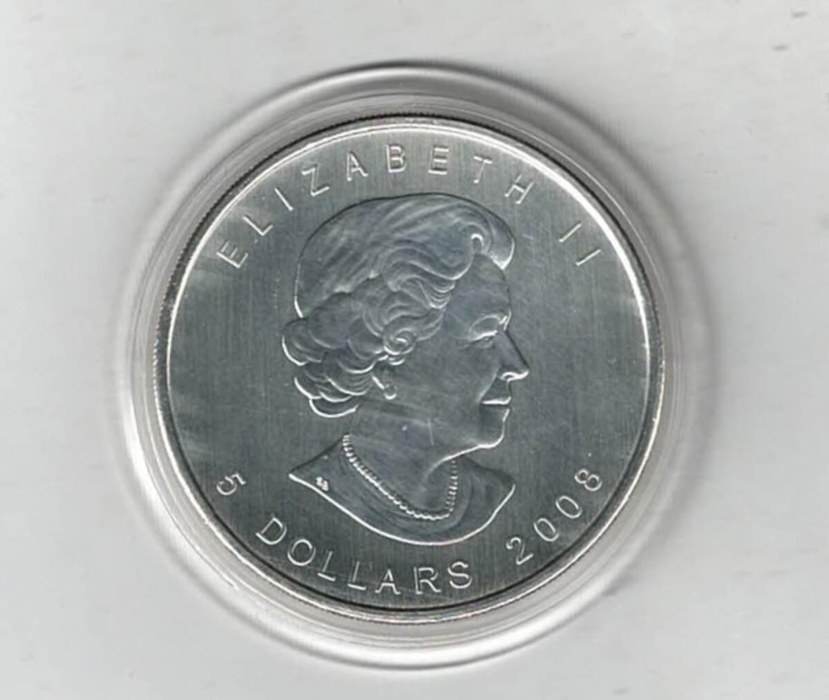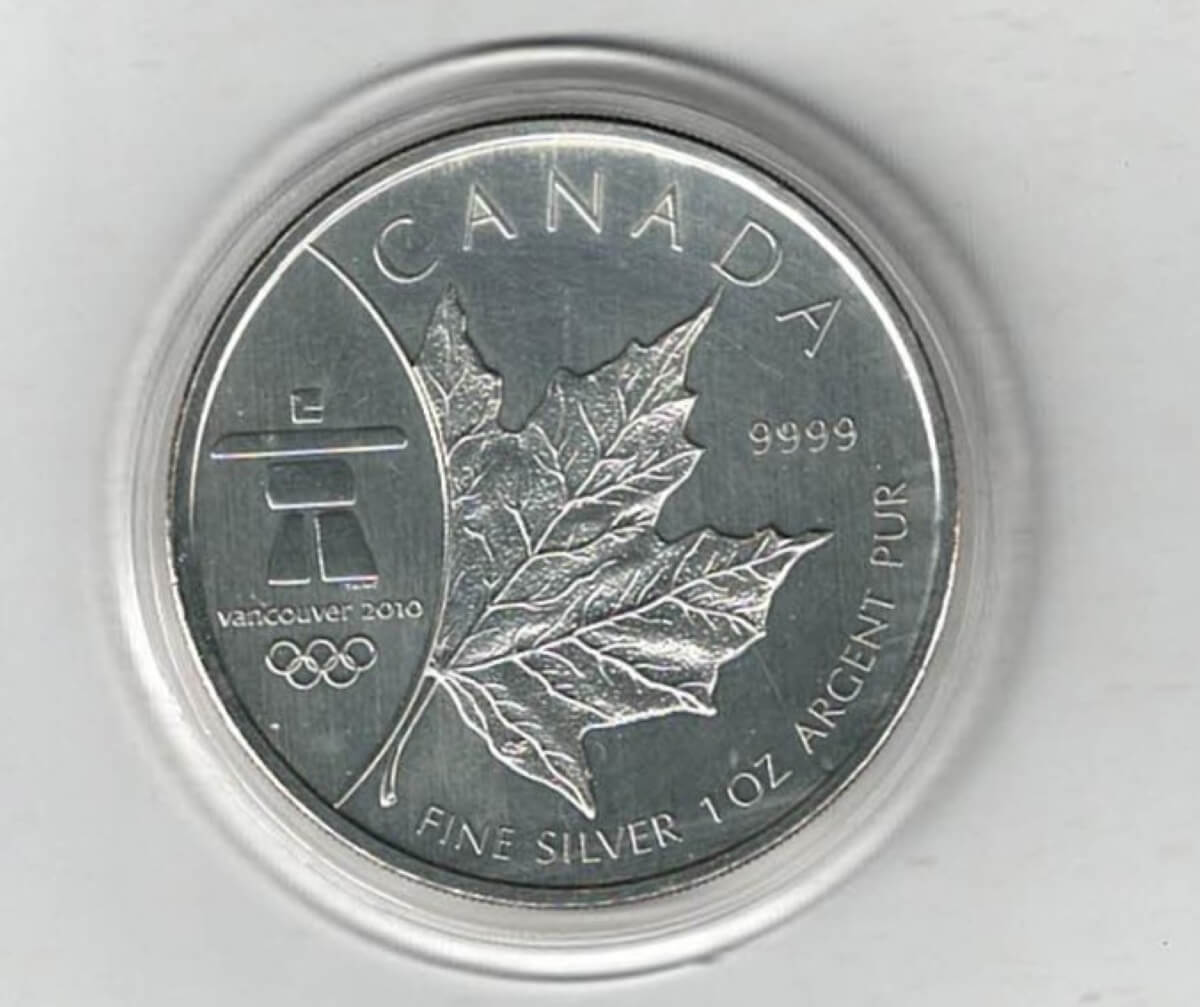 2008 Silver Canada One Ounce Maple. Elizabeth II is on the obverse, The Vancouver logo is on the reverse . The coin contains one ounce of 9999 fine silver.2008 Silver Canada One Ounce Maple Vancouver 2010
